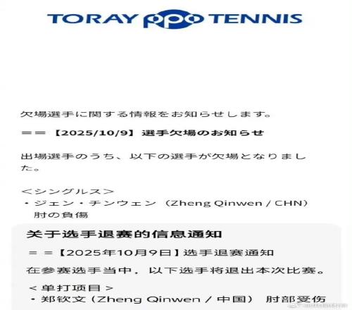 据央视新闻10月9日报道,据官方消息,赛事卫冕冠军郑钦文因肘部受伤退出WTA500东京站。此前,郑钦文已经因伤退出了武汉赛和宁波赛。