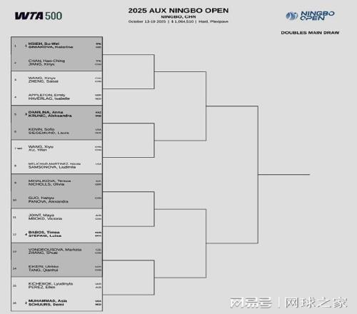 同期开打的WTA500宁波网球公开赛也官宣了正赛签表。俄罗斯新星米拉-安德列娃、意大利小钢炮鲍里妮、哈萨克斯坦名将莱巴金娜和俄罗斯人亚历山德洛娃位列单打前四号种子。中国球员首轮对阵:朱琳vs拉杜卡努、王曦雨vs施耐德、袁悦vs王欣瑜、张帅vs库德梅托娃。