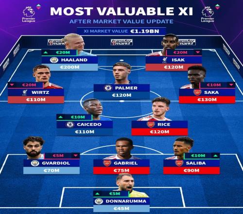 12月9日,德国转会市场网站更新了英超球员身价,并列出了英超最贵阵容,哈兰德领衔,阿森纳4人入选,利物浦、切尔西各2人。英超最贵阵容(总身价11.9亿欧元)门将:多纳鲁马(曼城,4500万欧元)